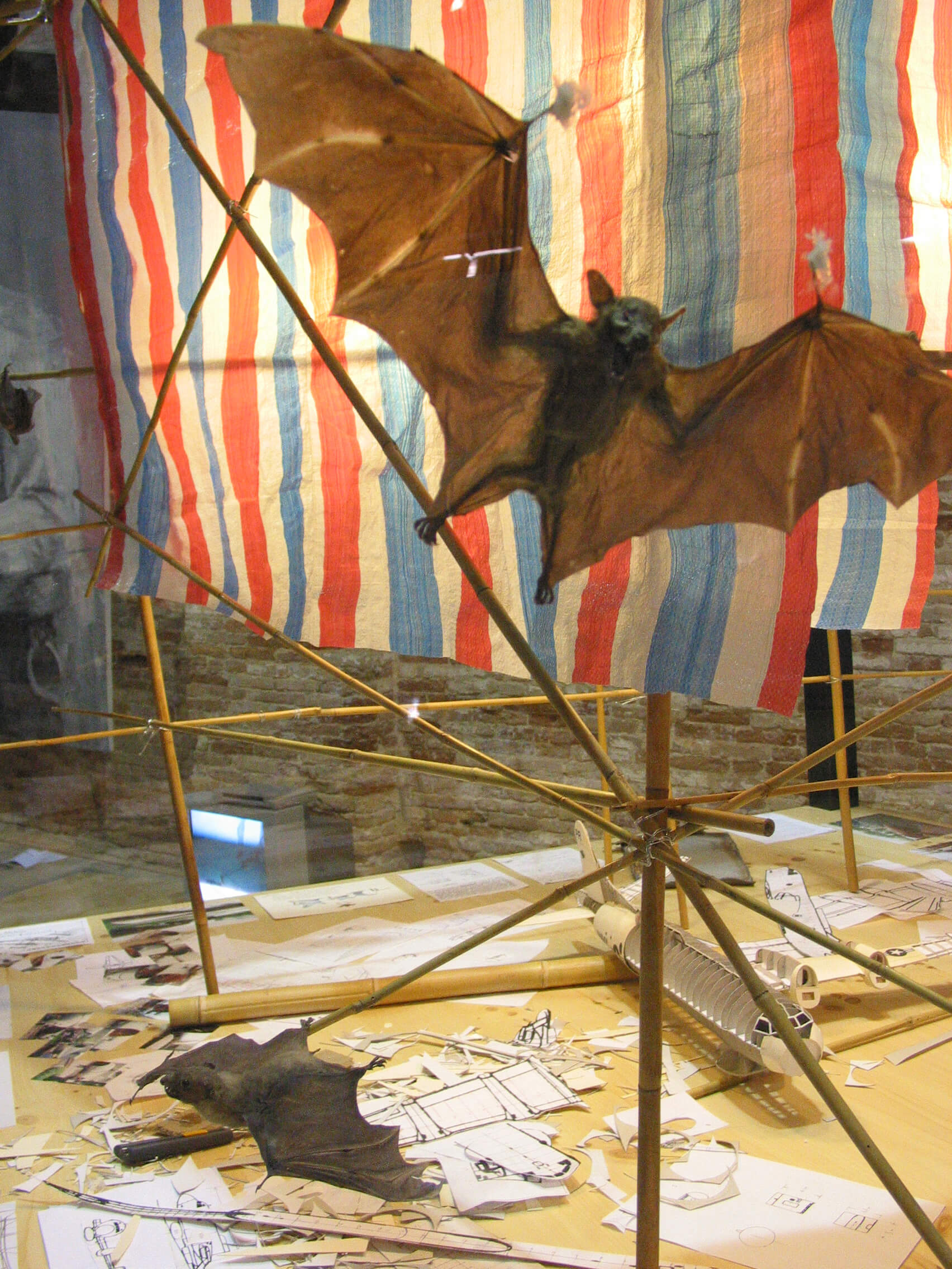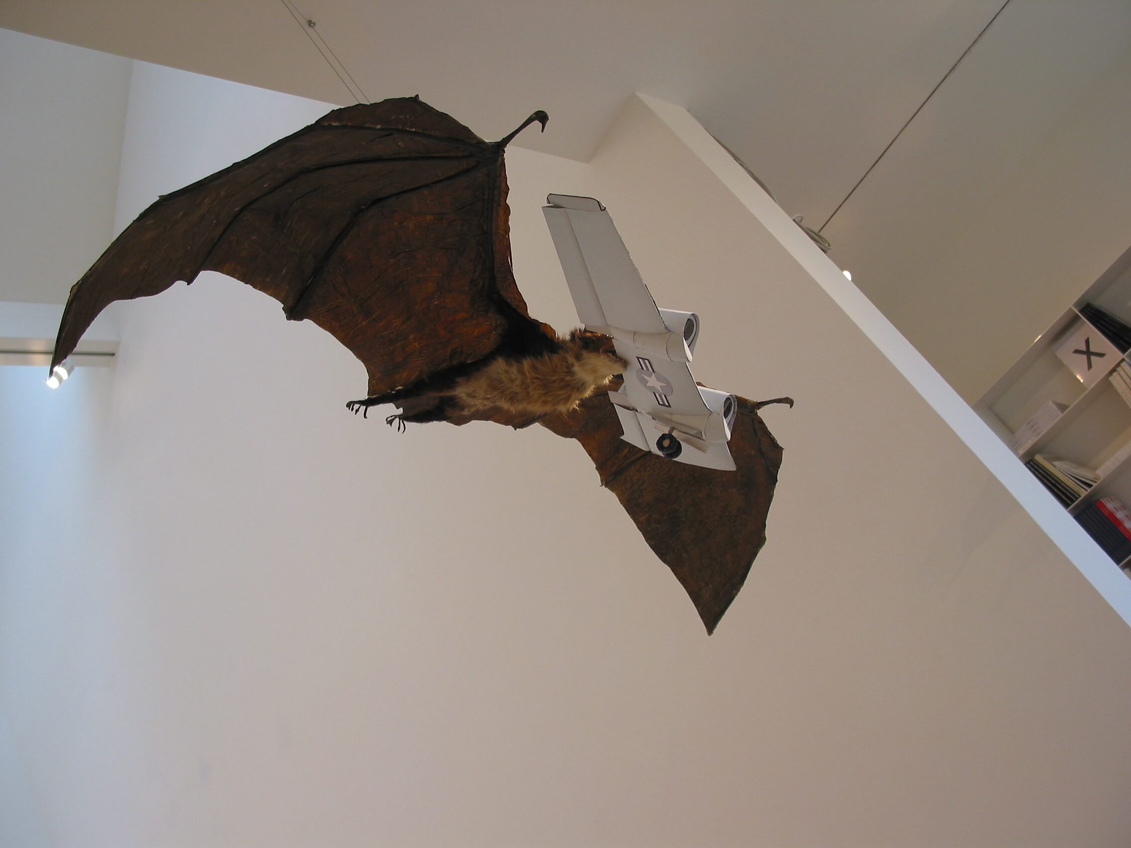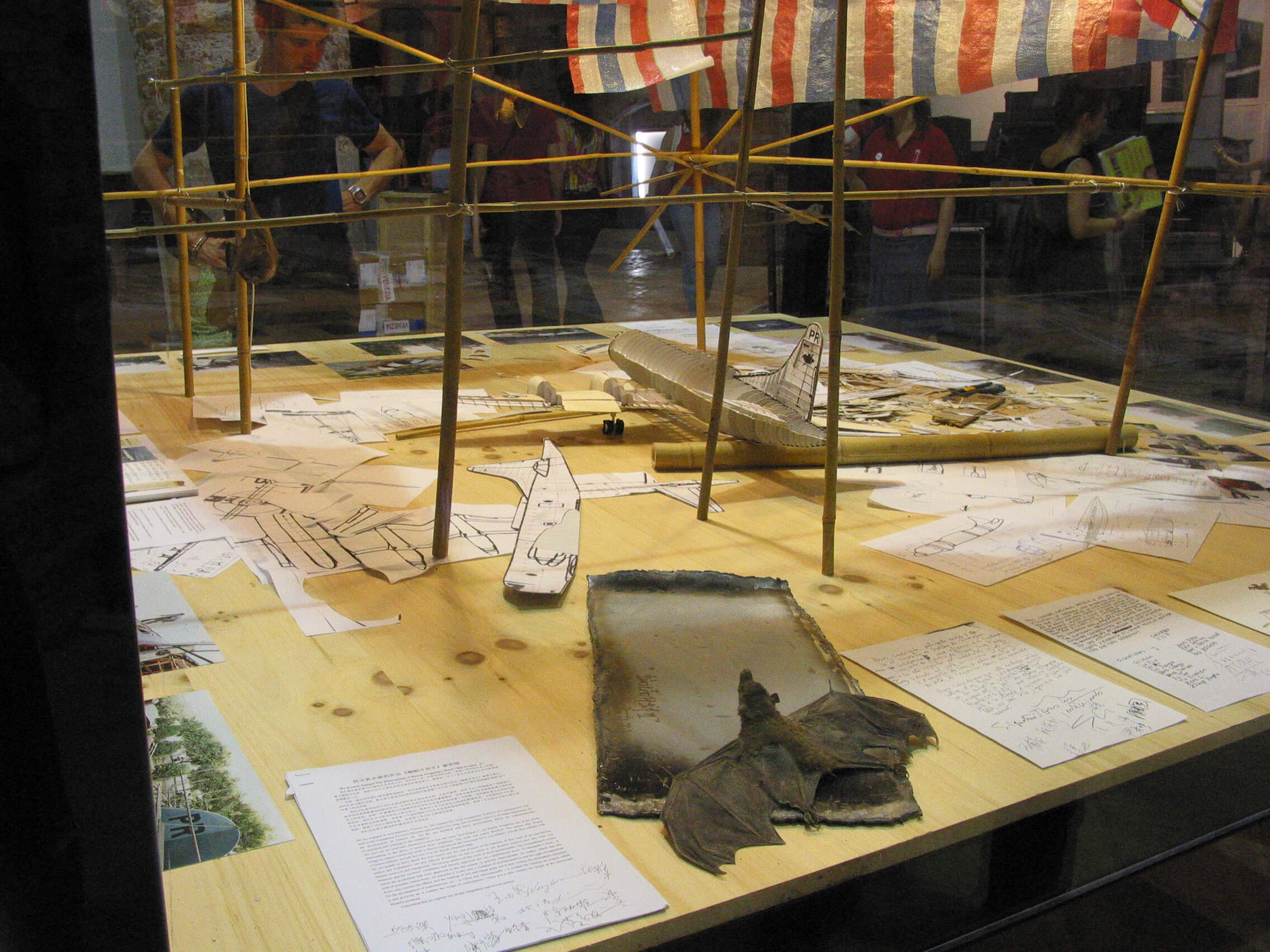 Airplane cockpit, bamboo scaffolding, construction plastic sheets, taxidermy bats, documents