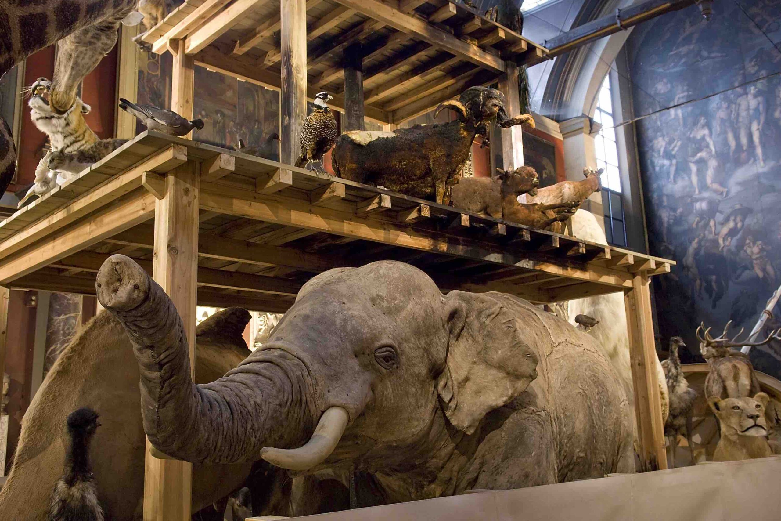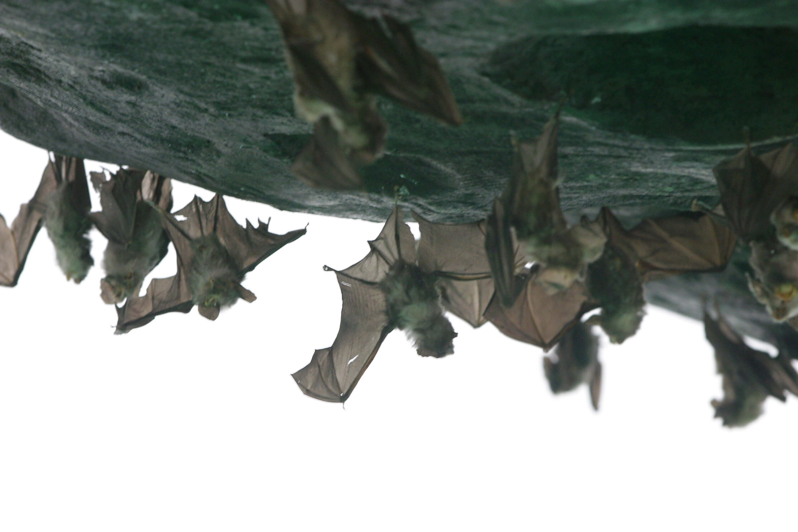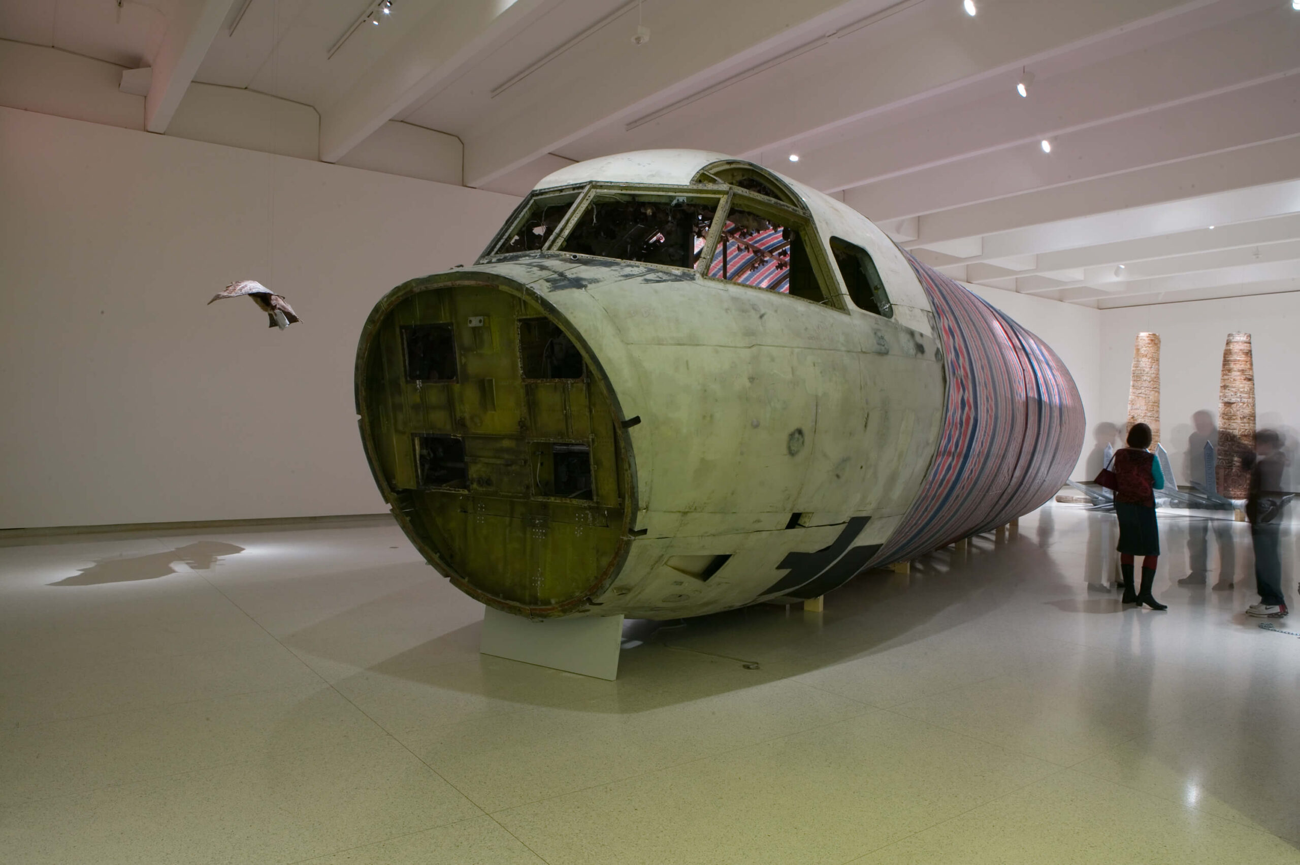 Airplane cockpit, bamboo scaffolding, construction plastic sheets, taxidermy bats, documents