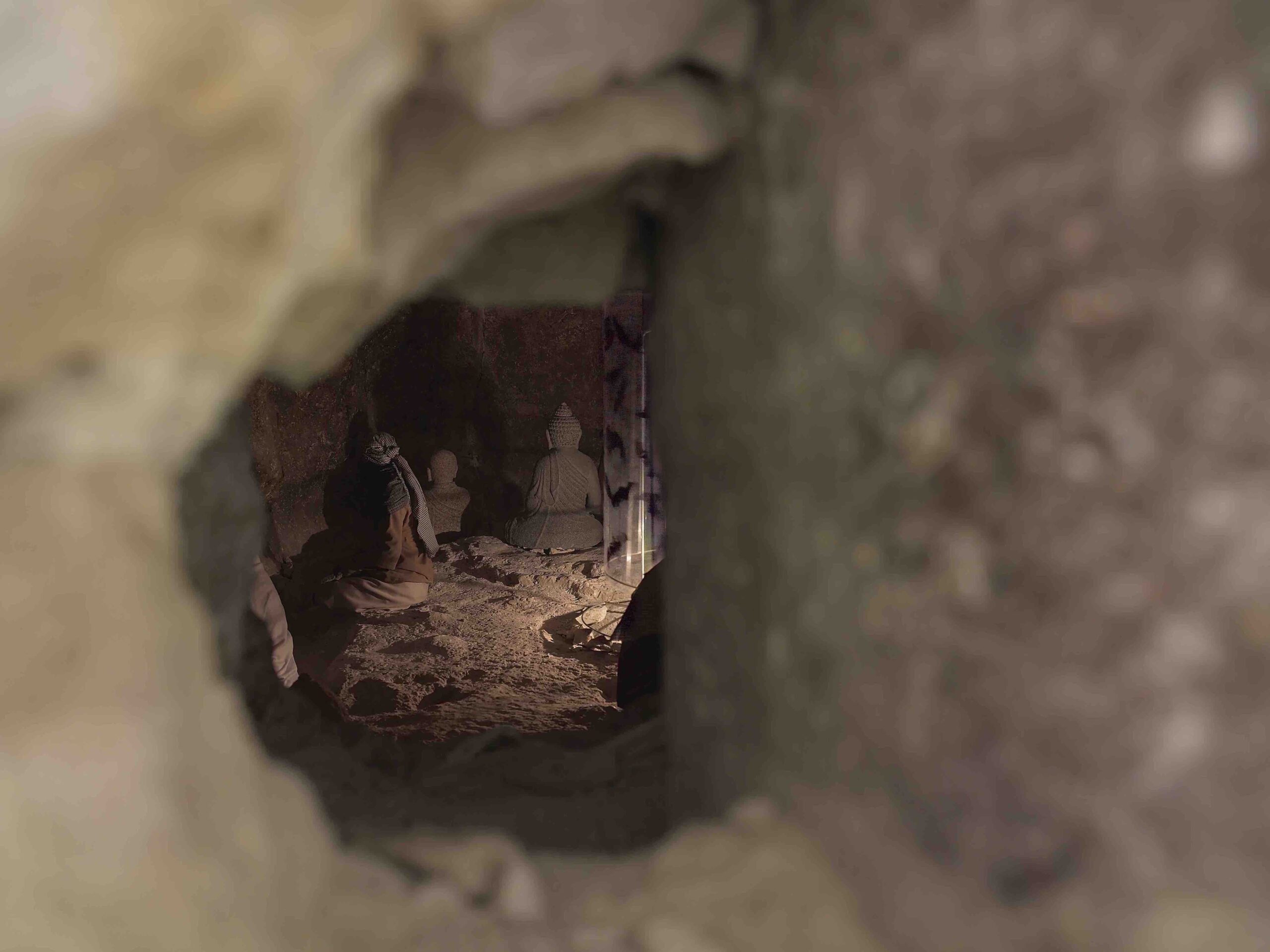 Resin cave, sculptures of Buddhas and Talibans, projection of bat shadows