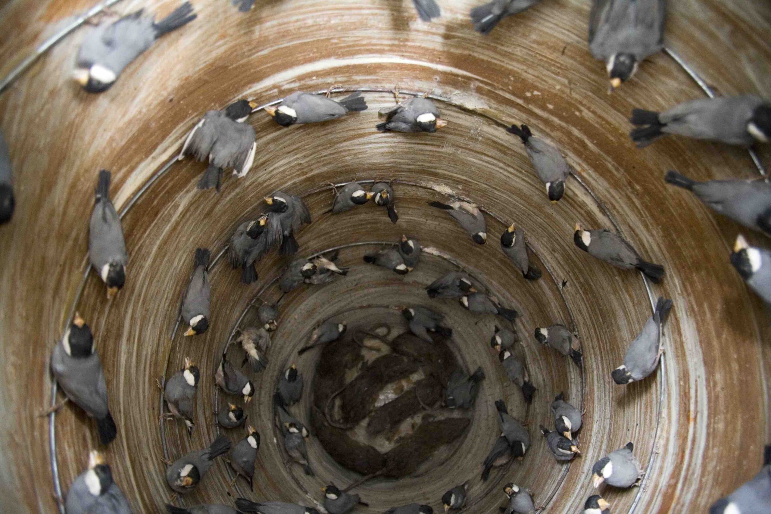 3 series of 3 ceramic jars of different sizes, taxidermy animals (snakes, peacock, rats, wolf, pigeons, crane)