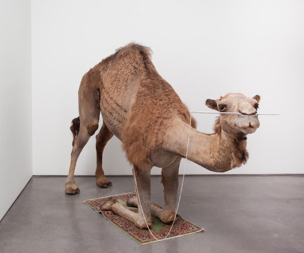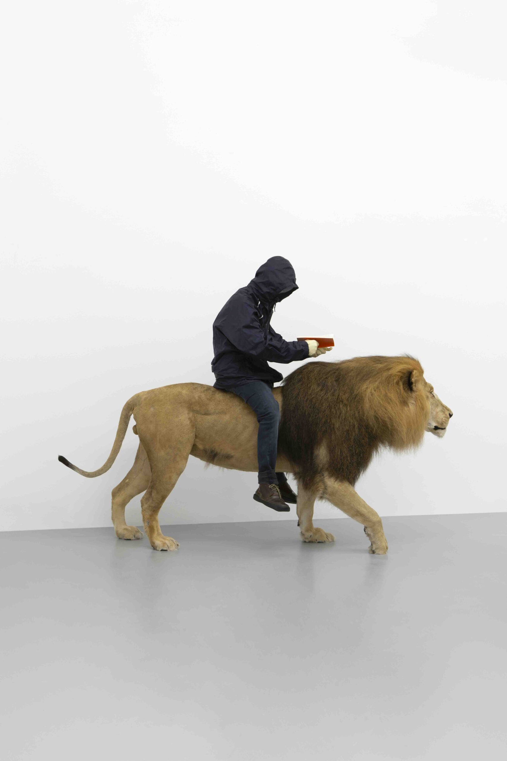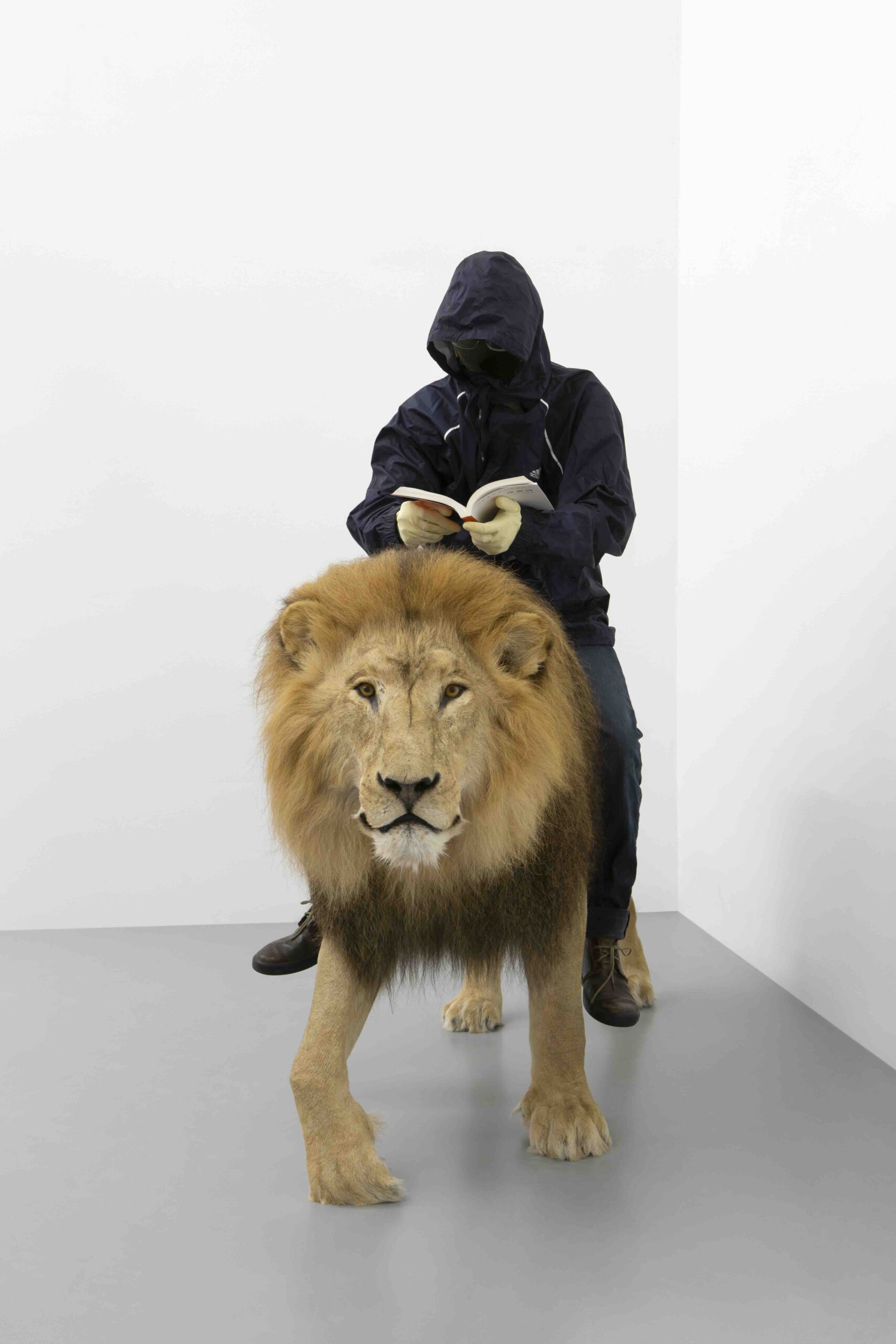 Taxidermy lion, book The Republic by Plato, artist’s clothes, rubber gloves, glasses, fiberglass mould