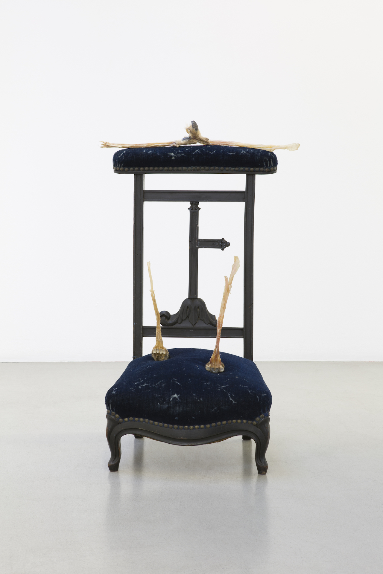 Pasta, cloth, chair, horse bones, cow bones, water, plastic basin