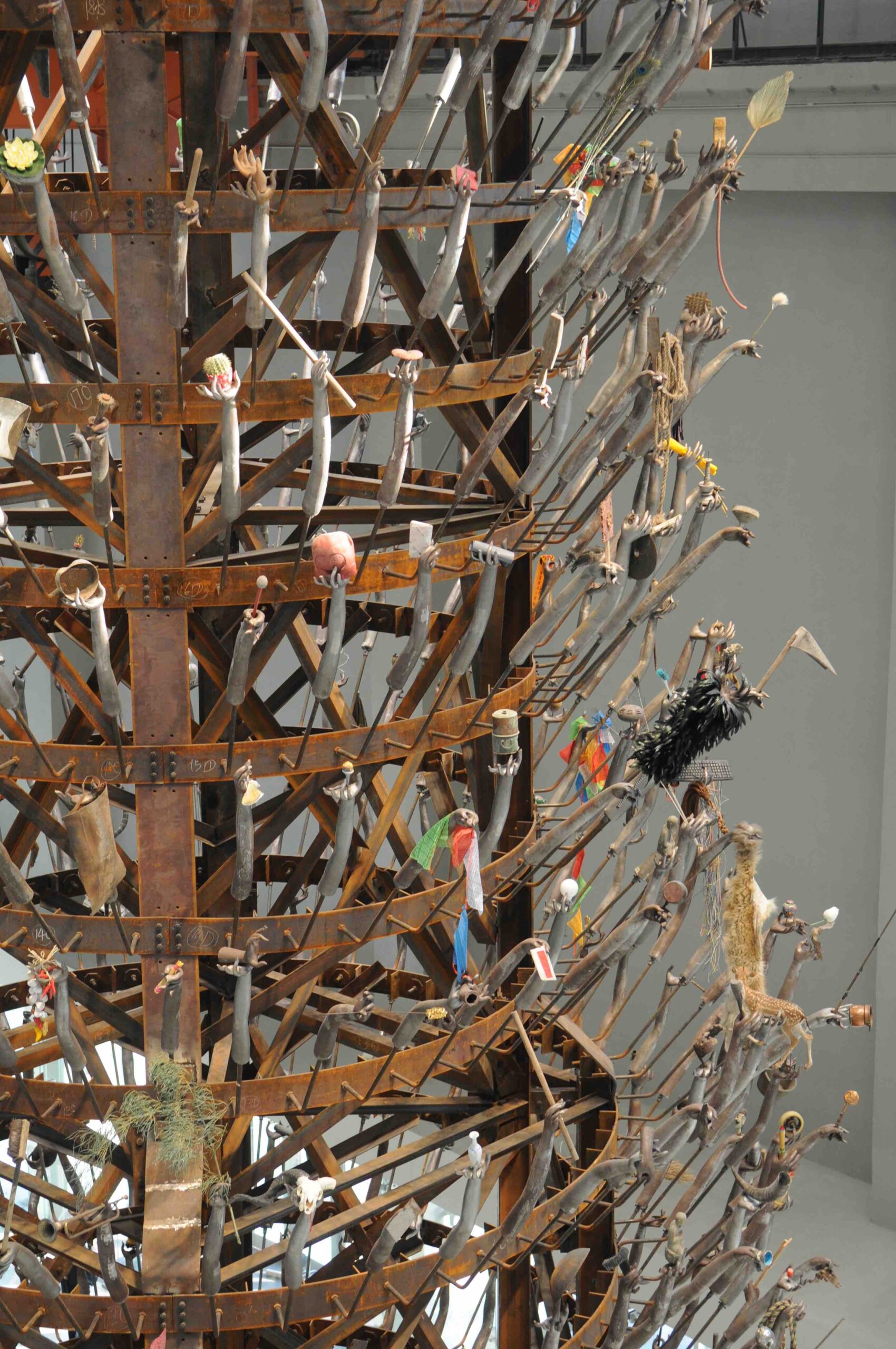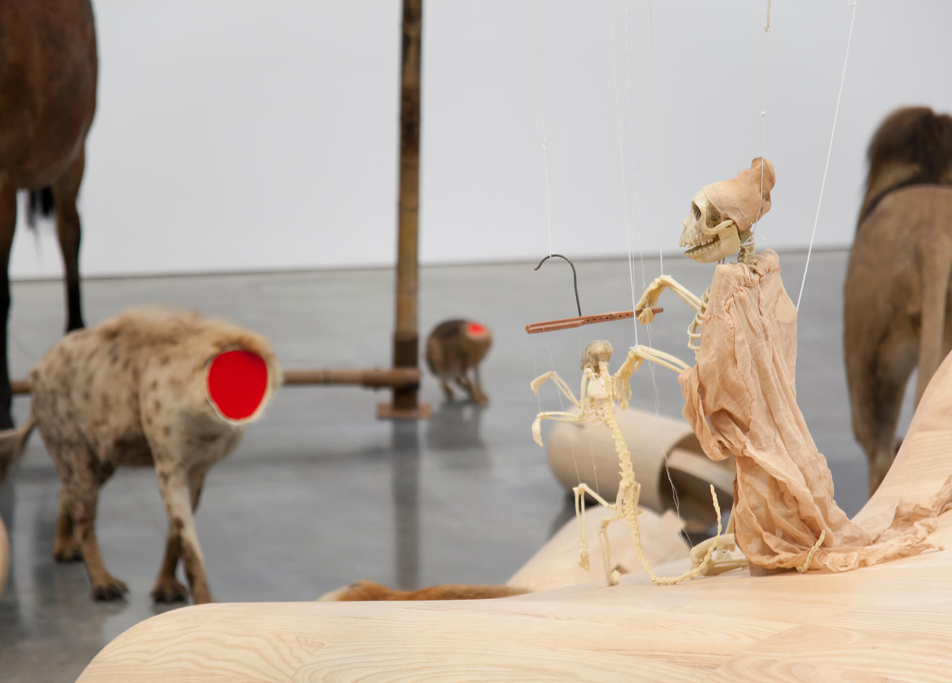 Wood, bamboo, taxidermy animals, steel, cord, cloth