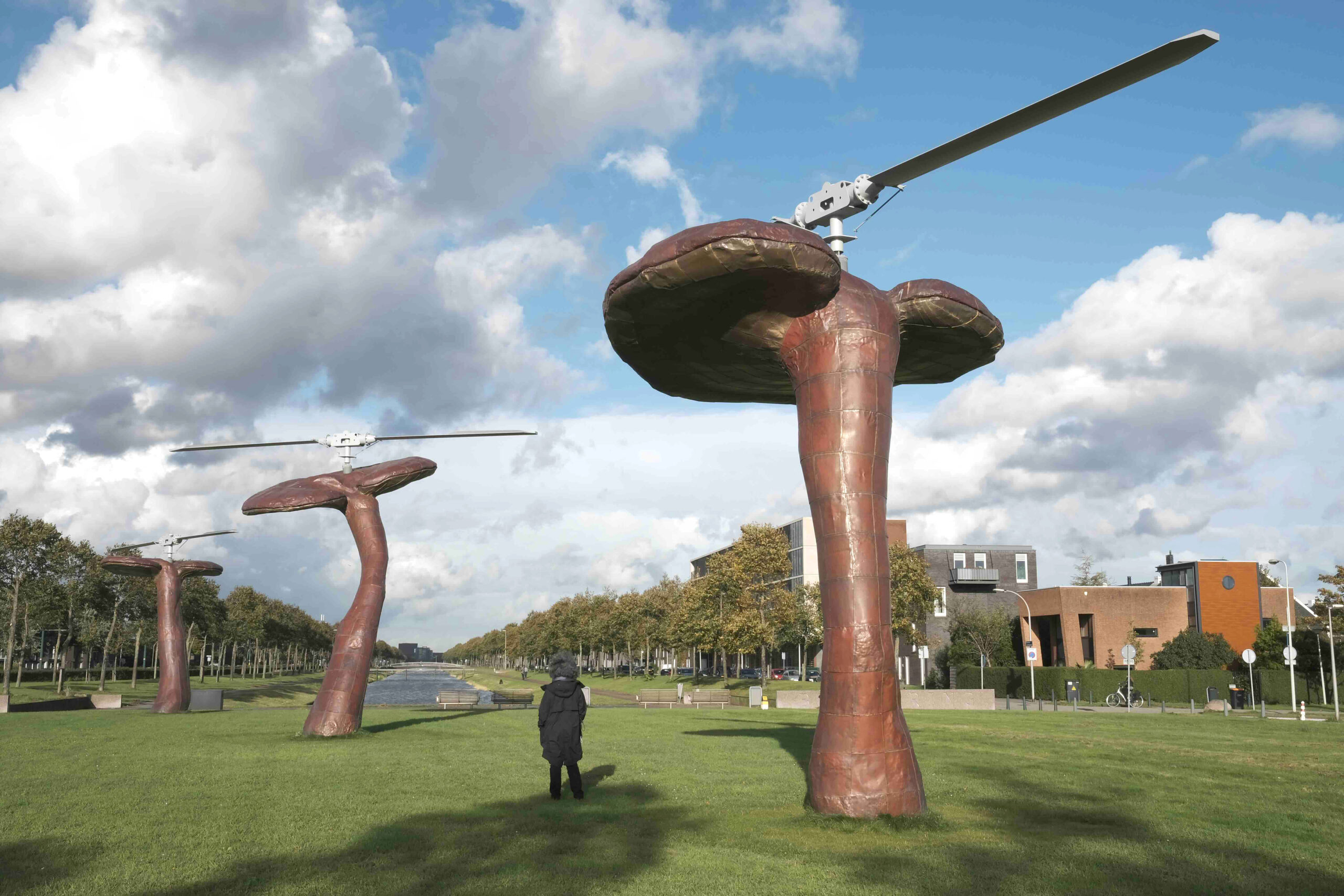 Foam, red copper sheets and yellow brass, rotor blades (wingspan of 10 meters), three mushroom helicopters of 550, 680 and 630 cm high